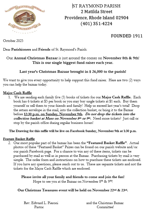 attend the bazaar and purchase your tickets in person. You can also mail the envelope to the Rectory at 2 Matilda Street, Providence, RI 02904.