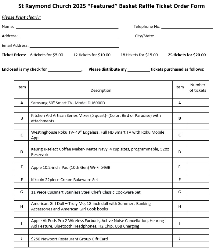 All Raffle and Basket Tickets must be RECEIVED by Monday, November 3rd to be included in the Drawing on