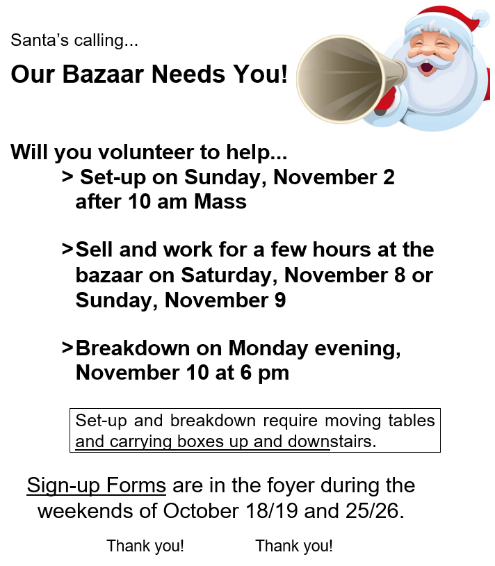 Sign-Up on the Sheets in the Atrium during October to volunteer! There are MANY ways to help — please read the “job” description and check the DATE & TIME listed for that activity.